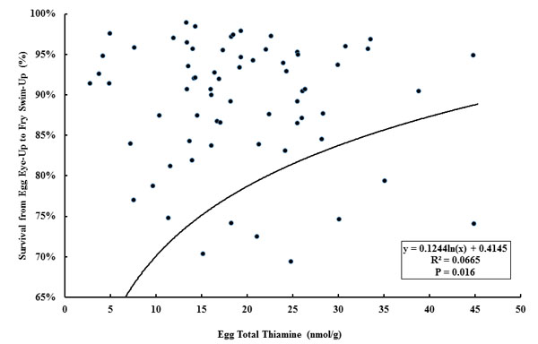 Overall mean survival to the eyed-egg stage was only 31.9%, with mean survival to fry swim-up at 26.4%. No significant differences in egg or fry survival were observed among any of the years. Survival to the eyed-egg stage and fry swim-up of the spawn containing eggs with 2.75 nmol/g total thiamine was 68% and 62%, respectively.