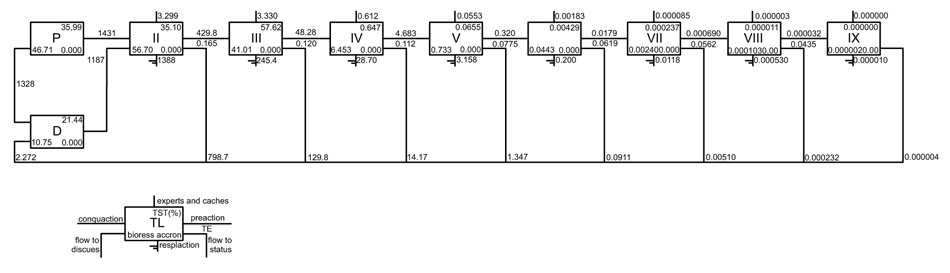 Fig. (2) illustrates a Lindeman spine with trophic chain and showing the trophic level II (TLII) consumptions is higher by detritus chain (D) than primary production (P) in a ratio 18:1 (D:PP). Most of the level II flows can be attributed to zooplankton (primary dominant consumers) and meiobenths and polychaets (dominant detritophages)). Flows in trophic level III derive from herrings and polychaets (lagoon). In the highest trophic levels, flows may be attributed to Synodontidae, and Muraenidae.