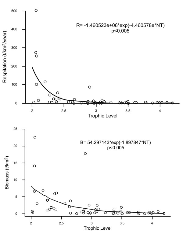 Fig. (3). Relationship for respiration (3a) and production (3b) over trophic level, showing a general tendency to decrease while trophic levels increase. |