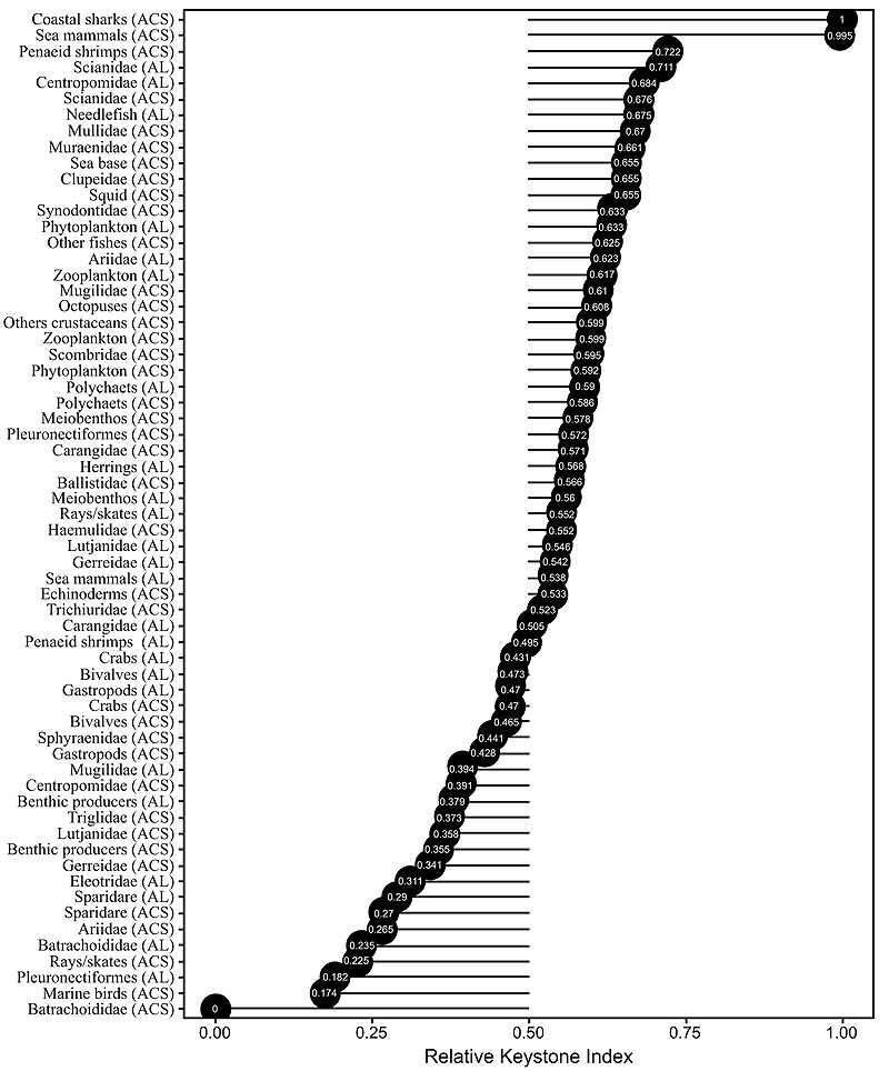 The most relevant groups in terms of this index were the following: coastal shark (4), marine mammals (1) and penaeid shrimps (46). Other groups with an important trophic position include lagoon-croakers (12), lagoon-snooks (33), and adjacent-croakers (11) (Fig. 5).
