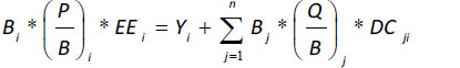 where Bi is the biomass of functional group 1 during a particular period for i = 1…n functional groups; P/B is the biomass production rate, which is equal to the total instantaneous mortality rate (Z) at equilibrium [70]; and EE is the ecotrophic efficiency (portion of production that is consumed, fished, or exported). Y is the catch per unit of time and space (Yi = FiBi, where Fi is the instantaneous mortality rate due to fishing), Bj is the predator (j) biomass, Q/B is the consumption/ biomass rate, and DCij is the portion of the diet of a given predator (j) occupied by a particular type of prey (i).