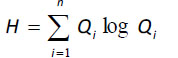 where Qi is the probability that a particle of energy will pass through I in terms of the total flows of the ecosystem [84, 85]. The surplus is the difference between the ascendency and the development capacity [84, 85].