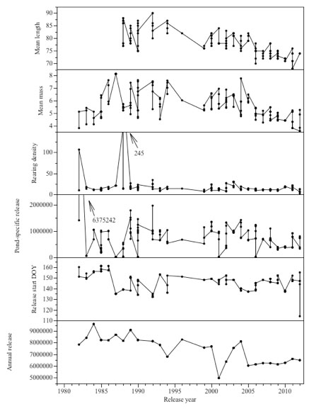 Information about age 0+ smolt releases (1982-2012) and returns (1983-2013) was provided by the Canadian Department of Fisheries and Oceans' Salmonid Enhancement Programme (C. Lynch and J. Bateman, Fisheries and Ocean Canada, Vancouver, BC, pers. comm). Subsamples of all release groups were marked using release-specific coded wire tags. We used pond specific information on length (mm) and individual mass (g) at release, rearing density (kg · m3), number of fish liberated in a given release, day of year when release started as well as total number of fish released from the Hatcher y in a given year. Fig. (2) shows how pond specific fish size, rearing density, number of fish released, release date and total hatchery release have varied over time. Release specific return by age estimates were the sum of tag code expanded catches and escapement to the Hatchery. We excluded data for the 1990, 1994, 1996, 1997 brood years because tag codes could not be assigned to ponds unambiguously.