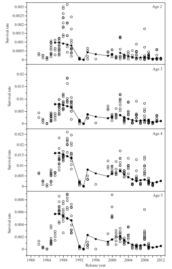 and C is expanded catch, E is expanded escapement to the Hatchery and R is the tag code-specific number of fish released from a pond; we used the logit of S in our analysis because the survival rate is a proportion. S is an apparent rate because it is the product of the marine survival and age-specific maturation rates.
