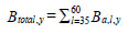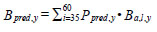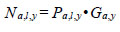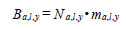 where a is age, l is cm length interval, y is year, P is proportion, and G is number of fish estimated from the hydro-acoustic survey. Age, length and year specific biomass was estimated as: