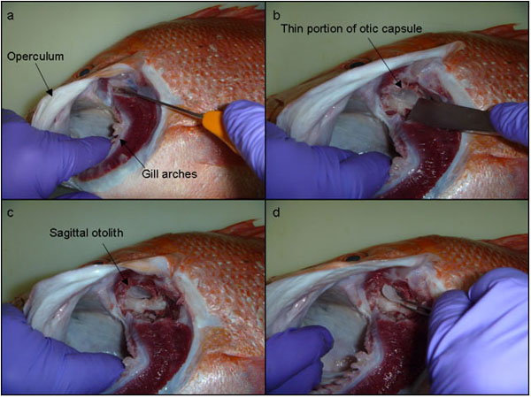 Sagittal otoliths of fish are currently regarded as the primary structure for obtaining reliable estimates of their age [1]. Deriving estimates of mortality from age structure data for an exploited population of fish is an integral part of determining their sustainable harvest through quantitative stock assessments. To improve the accuracy of stock assessment estimates it is vital that the collection of age structure data be representative of the temporal and spatial distribution of fishing catch and/or effort. Considering fish population monitoring studies are usually constrained by funding and resources, collections of otoliths rely on the assistance of fishers to allow scientists to perform fish dissections on their valued catches. Such access is often restricted due to the sampling process resulting in alterations to the fish’s external appearance and/or exposing internal structures to the external environment, subsequently reducing their value and shelf life (e.g. [2]). In order to reduce bias in age structure data during sampling access to catches needs to be maximised. This can be achieved through a rapid technique of otolith extraction that maintains the appearance and quality of sampled fish, which would thus overcome many factors that may prevent access for dissections prior to size-based grading (e.g. filleting of larger fish, selling of smaller fish whole), which reduces the potential for sampling bias.