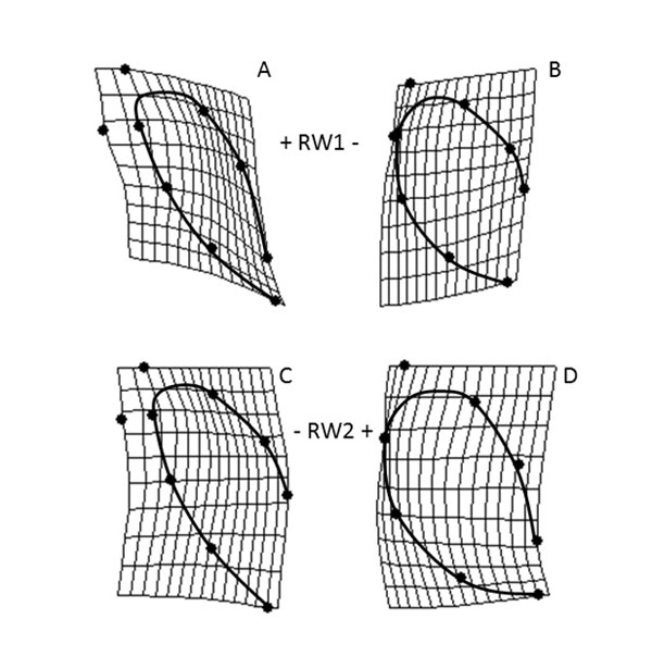Mean shape of the lower lip lobes varies among brood lots from typical June sucker morphology to typical Utah sucker morphology. On RW1 typical June sucker morphology (narrow lips and wide gap) is represented by positive scores (Fig. 2A) and the June sucker reference samples fall to the extreme right on this axis (Table 1; Fig. 3). Similarly, typical Utah sucker morphology (wide lips and no gap) is represented by negative scores (Fig. 2B) and the Utah sucker reference samples fall to the extreme left on RW1 (Table 1; Fig. 3). On RW2 June sucker morphology is represented by negative scores (Fig. 2C), and reference samples fall near zero (Table 1; Fig. 3). Utah sucker morphology is represented by positive scores (Fig. 2D), and reference samples are located on the positive end of the axis (Table 1; Fig. 3). Thus, brood lots that represent typical June sucker morphology are found in the lower right quadrant of the plot of RW1 and RW2 and brood lots that represent Utah sucker morphology fall in the upper left quadrant (Fig. 3).
