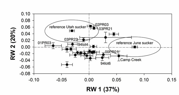 Means of shape of lower lips of brood lots on RW1 are mostly clustered between the extremes represented by the reference samples of June sucker and Utah sucker. None of the brood lots are as extreme as the June sucker reference samples, and only two brood lots have means that fall within one standard deviation of the mean of the June sucker reference sample. In contrast, all but 5 brood lots fall within one standard deviation of the Utah sucker reference sample on RW1 (Fig. 3). On RW2 most of the brood lots fall within one standard deviation of the reference sample of June sucker. Thus, most brood lots represent a hybrid morphology located between typical June sucker and typical Utah sucker phenotypes. The three brood lots that exhibit the most June sucker-like morphology of the lips are Camp Creek, 00PR01, and 94lot6. Five brood lots that exhibit the most Utah sucker-like morphology of the lower lips are 01PR03, 03PR21, 03PR22, 02PR03, and 94lot4 (Fig. 3).