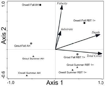 Cluster analysis revealed no significant difference in available habitat between streams and no significant difference in Rainbow Trout habitat use between streams. However, a highly significant difference was observed between available habitat and the habitat used by yearling Rainbow Trout in each stream. Data from both streams were combined for PCA. The PCA axis 1 (strongly associated with cover and depth) explained 95.9% and axis 2 (strongly associated with velocity and substrate) explained 4.1% of the variation in habitat variables in Grout Brook and Orwell Brook (Fig. 2). Yearling Rainbow Trout in Orwell Brook exhibited more seasonal variation in habitat use than trout in Grout Brook. In autumn stream discharge in Orwell Brook increased 564% compared to only 117% in Grout Brook. This difference was likely associated with greater variation in summer versus autumn stream discharge that occurred in Orwell Brook compared to Grout Brook. Compared to yearling Rainbow Trout habitat use in Grout Brook during both seasons and in Orwell Brook during summer, trout in Orwell Brook during the autumn occupied areas that were faster and had larger size substrate. Based on the distance between trout habitat use centroids, and available habitat centroids, there was no difference in habitat selection between streams or between seasons within a stream (Fig. 2).
