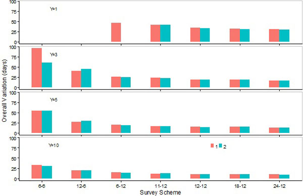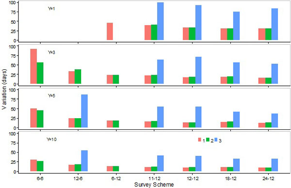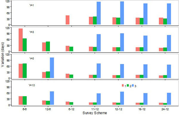 Variations in the estimation of the peak, lower, and upper days, as well as overall variations, were higher for 6-month than 12-month survey schemes (Figs. 9-12). Differences increased when the number of survey years decreased from 10 to 5 or 5 to 3 (Figs. 9-12).