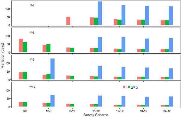 Mean variations decreased when the number of survey years increased. However, the extent of the decrease with one additional survey year declined when the number of survey years increased. The extent of the decrease was marginal with 5 survey years (Fig. 8B).
