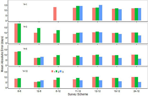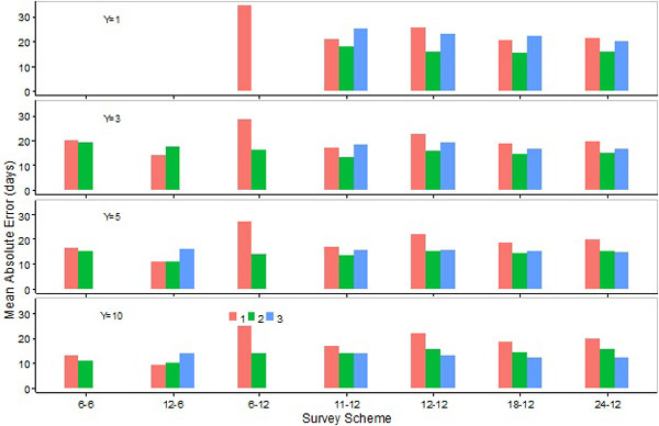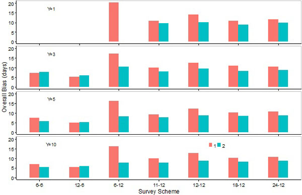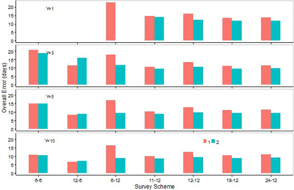 Mean absolute errors in the estimation of the peak, lower, and upper days, as well as overall errors, were lower for S12-6 than S6-6 (Figs. 13-16). Increasing the number of sampling events in 12-month survey schemes did not necessarily reduce mean absolute errors. Mean absolute errors in the estimation of the peak or upper days by M1 or M2 were, in general, slightly lower for S11-12 and S18-12 than S12-12 and S24-12. Mean absolute errors in the estimation of the lower day decreased slightly as the number of years increased in 12-month survey schemes (Figs. 13-15). When M2 was applied, overall errors were comparable among 12-month survey schemes (Fig. 16). In contrast, when M1 was applied overall errors were lower for S11-12 than other 12-month schemes, and such errors were noticeably higher for S6-12 (Fig. 16).