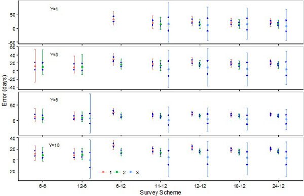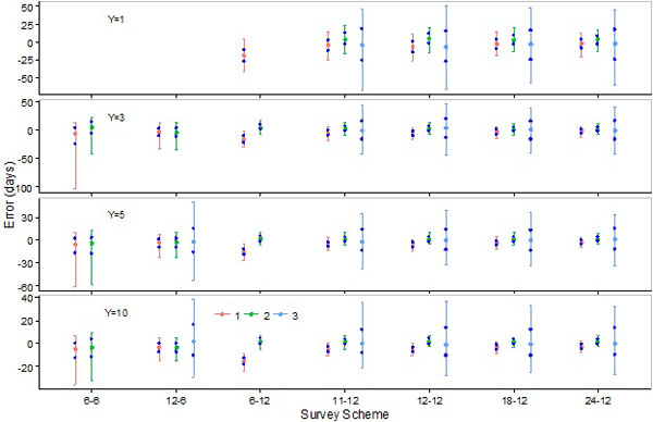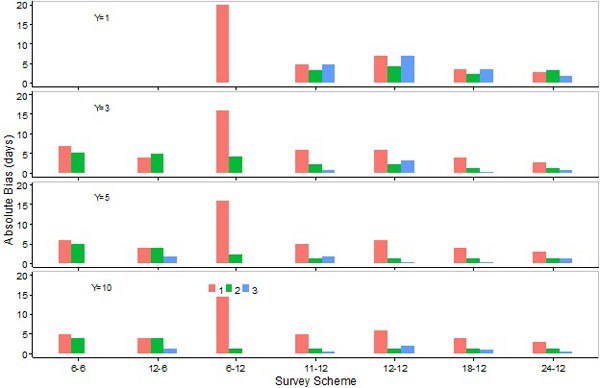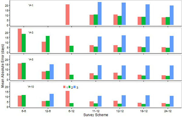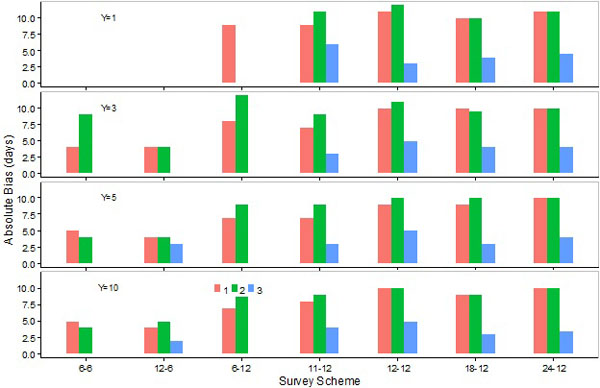At times the models produced very imprecise outputs. For instance, in most cases where the survey program lasted for only one year, ranges between the 5th and 95th percentiles of errors in the estimation of the peak day are well above 100 days. The generalized additive model also failed to produce sensible results for certain survey schemes, even when surveys were conducted during multiple years. These flawed outputs were not presented.
