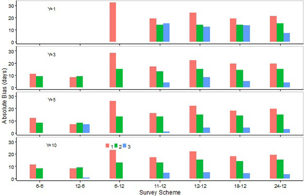 Absolute biases in the estimation of the peak, lower, or upper days, as well as overall biases, were either similar or lower when a survey scheme changed from S6-6 to S12-6 (Figs. 4-7). Increasing the number of sampling events in the 12-month survey schemes did not necessarily reduce biases. Absolute biases in the estimation of the peak or upper days by M1 or M2 were lower for S11-12 compared to S12-12, S18-12 or S24-12, and slightly lower for S18-12 compared to S12-12 or S24-12 (Figs. 4, 6). Absolute biases in the estimation of the lower day by M1 or M2 were more comparable among survey schemes S11-12, S12-12, S18-12, and S24-12 (Fig. 5). Overall biases were lower for S11-12 than for other 12-month survey schemes when M1 was used, and comparable among the 12-month survey schemes when M2 was used (Fig. 7).