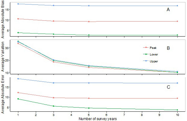 Mean absolute biases decreased slightly when the number of survey years increased from 1 to 3, and remained virtually unchanged when the number of years increased beyond three (Fig. 8A).