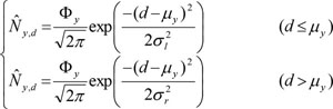 where subscripts, y and d, represent year and day, respectively, σl and σr are two standard deviations set to be 60 and 70 respectively (Table 1), and (µ) is the day (peak day) with the maximum number